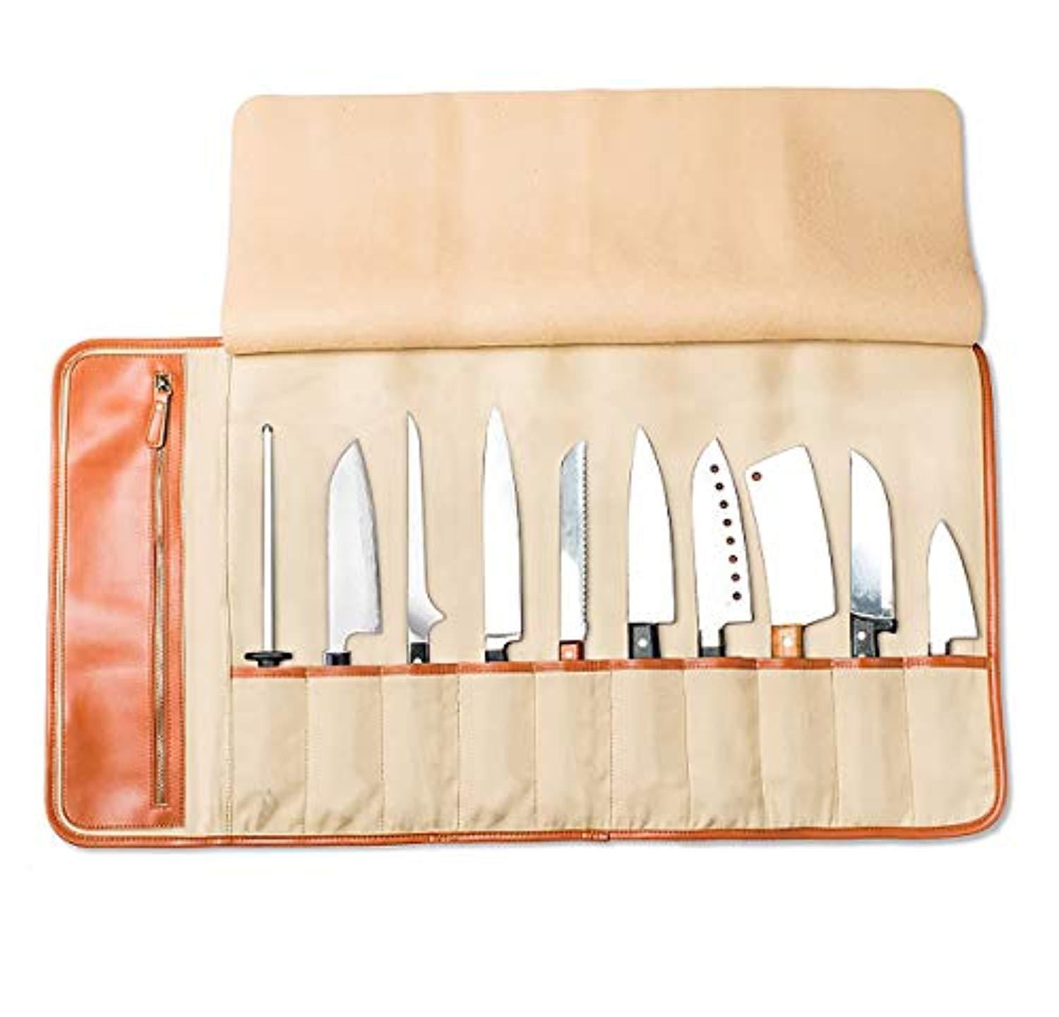CONVENIENT ACCESSIBILITY – Each professional-grade knife bag holds 10 kitchen knives and accessories, such as paring, carving, ceramic, scissors, and other chef utensils or tools. TRAVEL-FRIENDLY DESIGN – These knife rolls for chefs boast an easy-carry handle, and a shoulder strap which allows convenience and portability to carry your knives with ease and safety when going to work, camping, or barbequing. QUICK & EASY STORAGE – EVERPRIDE knife rolls hold knives up to 18” in length, store utensils as well as a knife sharpener, and form a tight roll when buckled. KITCHEN DURABILITY – Ideal for the sous or personal chef, as well as the aspiring enthusiast and culinary chef student, these knife bags for chefs offer tough cut and puncture resistance. KNIFE SAFETY & SECURITY – Each of these knife cases for chefs allows you to store your knives more safely in the secure roll, our canvas protects them from nicks, scratches or moisture when not in use.