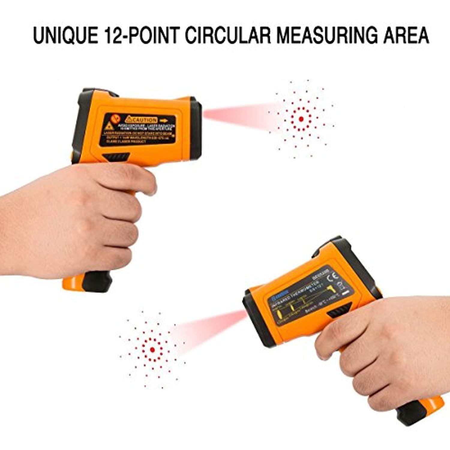 2.More Accurate Aiming: Laser Thermometer with 12-Points laser accurate aiming function; 12 points form a circular measurement zone at the ratio of D:S=12:1, giving the more precise data, resolution ratio: 0.1℃/0.1℉;accuracy up to ± (1.5% reading + 2℃/3.5℉); Besides, the auto power-off can be done after the data showing for 10s.