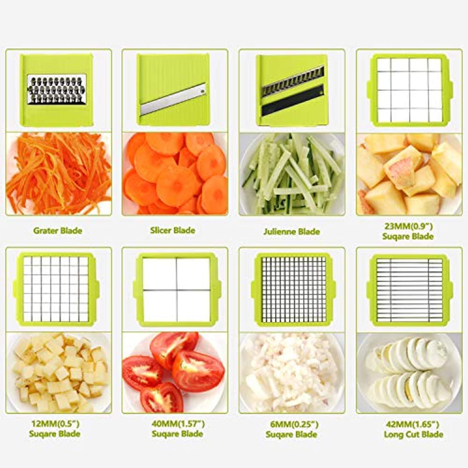MULTI FUCTIONAL ONION CHOPPER ALSO CAN DO SLICING JOB:The vegetable chopper contains 8 interchangeable stainless steel blades which means you just press for the food and it will be chopped so that you can take whatever food you need as you like.You can chop,slice, cut with the different blades.
